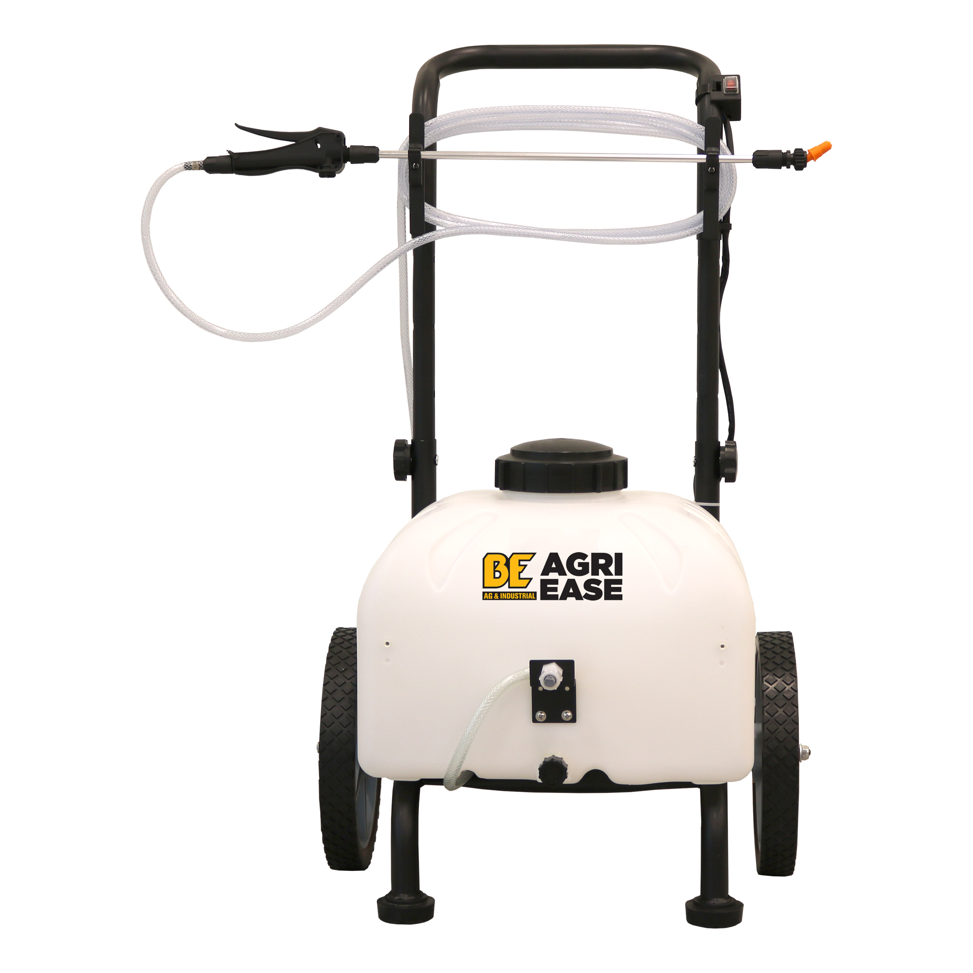 Tirez-le ou remorquez-le ! Roule facilement sur terrain accidenté ! Batterie rechargeable de 12 volts 2 heures d'autonomie sur une seule charge Buse montée à l'avant avec andain de 50" Comprend une barre d'attelage pour le remorquage Poignée réglable pour le rangement roues de 12 pouces réservoir de 9 gallons Compatible avec le glyphosate Pompe de 1 GPM